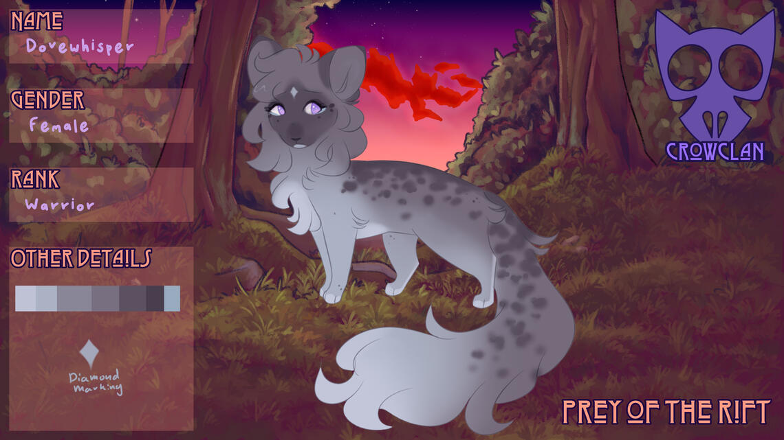 • Dovekit was born alongside two siblings, Paleheart immediately saw their potential for greatness. Giving them bird names to associate them to nobility in Crowclan.