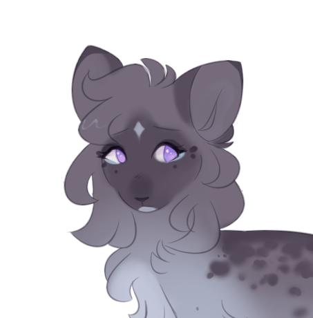 - PettyConditions: Built a Parasocial relationship of admiration and idolization towards her brother, Jaystar, as she was taught from a young age that Jaystar was born to do great things. She was conditioned to support her siblings to the end for the greater good.^Body Type: Slim, but a little bit of thickness in the abdomen area. Very sleek, feathery fur. Short but curly / silky furred. Legs look long proportionate to her short body length.Simple Description: Silver and dark gray dappled she-cat with purple eyes.Accessories: N/ALimited Traits: N/AViews: